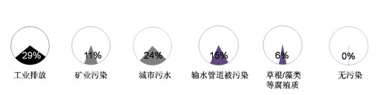 ——污染源:城市水污染主要与产业结构有关,工业排放(29%)和“矿业污染”(11%)对水资源的污染占到四成。值得关注的是,“城市污水”污染被24%被访者认为其是主要污染源。兰州水污染事件让人们注意到了“输水管道被污染”对水安全造成的影响,15%被访者认为自己所住城市的水污染受此影响。有专家分析水污染,认为“草根、藻类等腐殖质”是主要原因之一,被访者中6%接受这一看法。