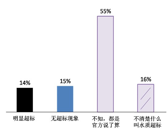 ——对于“水杯里的饮水安全”,只有不到三成的被访者给了我们“明显超标”(14%)或“没有超标现象”(15%)的明确答案。七成被访者对此一片茫然:55%被访者表示“不知道,超不超标都是官方说了算”,16%的人甚至“不清楚什么叫水质超标”。