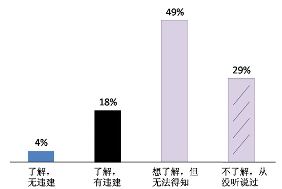 ——对“饮用水水源?;で闭庖回厝褐谝踩徒】等ǖ墓娑ǎ挥辛匠扇褐诒硎尽傲私狻?,并明确地告诉我们“有违建项目”(18%)或“无违建项目”(4%)。八成被访者对此并不知晓,29%的人“从没听说过”,也并没有想要了解的意愿。半数(49%)被访者“想了解”,但无奈于“信息不透明,无法得知”。