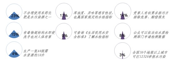 ——对于自己在水安全方面,有哪些权利、如何维护等问题,人们有所了解,但人数比例较低。例如17%知道“浑浊度、异味等感官性状,也属于国家规定的水质检测指标”,而只有9%的人知道“想了解水质检测有哪些指标,可查询《生活饮用水安全标准》”;在维权方面,14%被访者知道“受害人有权要求排污方排除危害、赔偿损失”,8%知道“公众可以依法向水质检测部门申请检测数据”,“目前全国有30个地级以上城市可拨打12320举报水污染事件”,但只有3%的被访者了解这一点,6%的被访者对上述我们所提出的水安全知识表示“一概不知”。