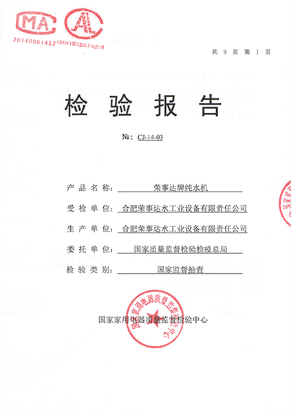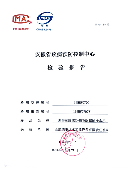 RSD-UF500超滤净水机检验报告...