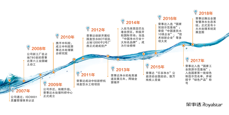2018年5月,荣事达正式发布十大水处理系统发展蓝图,全面布局全屋智慧净水、校园直饮水、城市公共饮水、社区智慧饮水、农村安全饮水、工业污水处理、生活污水处理、景观水处理、医疗用水处理、海水淡化十大领域。