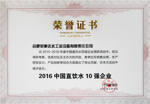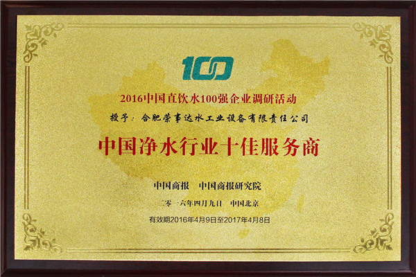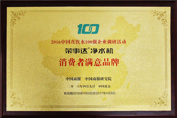 评审委员会由主办方领导、净水行业专家、战略媒体、行业媒体、第三方调研机构及消费者代表组成,用国际通行方式,历时三个多月,依据中国商报研究院发布的权威、公正,有影响力的净水企业调研报告,综合考虑消费者对于品牌的认知度、忠诚度及美誉度,评选出包括美的、3M等在内的百强企业,荣事达名列前茅,荣获“中国直饮水10强企业”、“消费者信赖企业”、“中国净水行业十佳服务商”、“消费者满意品牌”多项大奖。