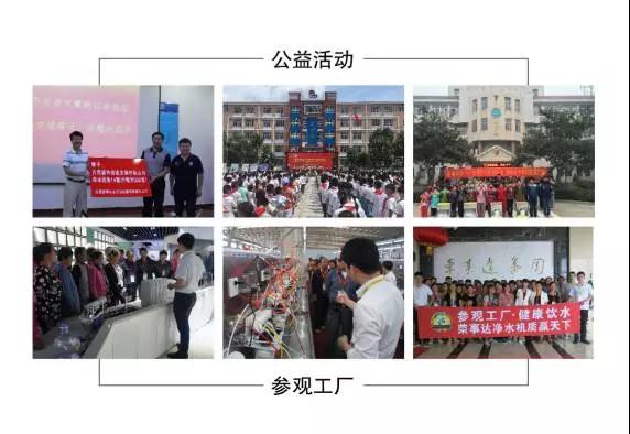 荣事达针对消费者对净水机了解不足的问题,长期推出“参观工厂”活动,让消费者全面见证产品生产和质检的流程,加强消费者对净水机的种类、功能、技术的认知,引导消费者正确认识和选购净水机。同时,关注弱势群体,积极践行公益,发起过“爱心传递 健康助学”等多项活动,在2015年携手安徽省青年志愿者协会启动“乐享净水”大型助残公益项目,荣获安徽省志愿者服务项目大赛二等奖,号召并带动更多爱心人士投入其中,树立起公益典型,该活动已在安徽、湖北、湖南、江苏、江西、河南、山东、陕西、广西等多个省份,为400多个助残机构及残疾人士家庭提供公益服务,捐赠、安装净水设备1500多套,开展各项帮扶活动、健康饮水知识讲座500余次,受惠残疾人口超过30000人;日前,为全国首个希望小学——金寨县希望小学免费提供了直饮水设备,发起“给山区孩子一杯水”援建金寨中小学生净水设备公益活动,解决山区孩子饮水难题。