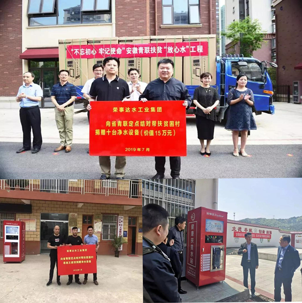 此外,为解决部分贫困地区“因水致病 因病致贫”的难题,荣事达积极响应国家“精准扶贫”号召,责任上肩,担当作为,大力发展健康扶贫事业。前不久,荣事达携手团省委、省青联启动“青力扶贫 联创梦想”健康扶贫“放心水”工程,荣事达向安徽地区贫困村捐赠净水设备,建立健康扶贫水站,让村民们喝上健康水。建立“健康扶贫水站”是荣事达参与建设贫困地区饮水健康保障体系的重要措施,在为村民们提供干净无污染的饮用水环境的同时,有效防止“病从口入”,实现健康脱贫。目前荣事达已在河北邯郸、金寨县漆店村、阜南县王家坝村等多地建立扶贫水站,成功解决当地居民饮水安全问题。