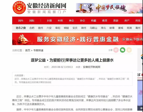 安徽经济新闻网 《逐梦公益 · 为爱前行|荣事达让更多的人喝上健康水》