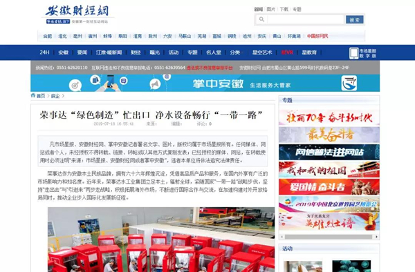 安徽财经网 《荣事达“绿色制造”忙出口 净水设备畅行“一带一路”》