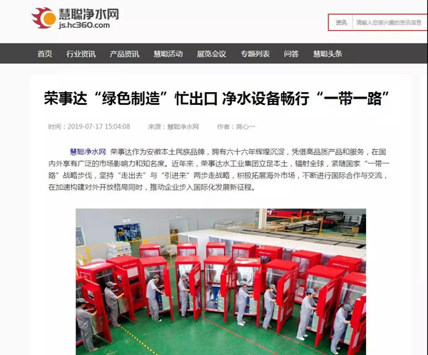 慧聪网 《荣事达“绿色制造”忙出口 净水设备畅行“一带一路”》