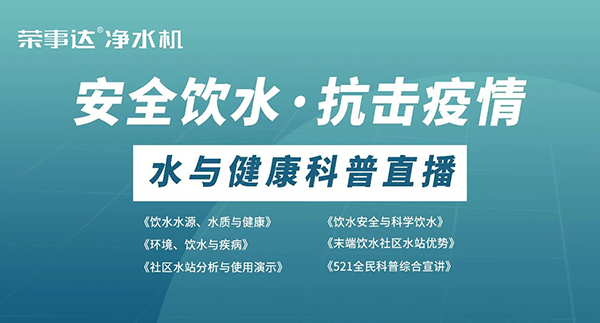 在新冠疫情的特殊时期,荣事达联通线上线下网络,走进终端用户社区、企业物联网产品体验中心、企业科研实验室等区域,围绕“饮水水源、水质与健康”、“饮水安全与科学饮水”、“环境、饮水与疾病”、“末端饮水社区水站优势”等主题开展了场全民科普直播。讲师们采用现实案例分析、趣味互动问答、生活知识讲解、水质安全实验等形式,让大众更深刻地知道健康水的标准以及水与人体健康的关联性,共同树立正确的饮水观念,科学合理饮水。