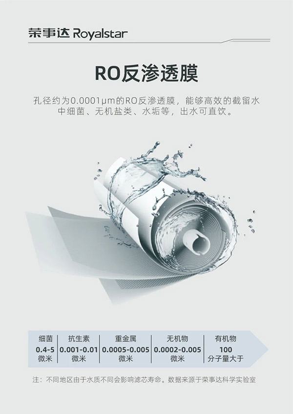 产品采用RO反渗透技术和五级过滤系统,PP棉有效滤除原水中的铁锈、泥沙等颗粒物;压铸活性炭滤芯吸附净化,有效滤除余氯及异色异味;RO反渗透膜有效滤除水碱水垢及重金属微生物;后置活性炭改善口感、出水甘冽。完美解决学校饮水各项难题,满足师生健康饮水需求。