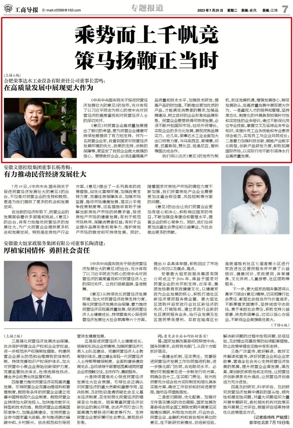 近日,《工商导报》报道了合肥荣事达水工业设备有限责任公司董事长雷鸣关于《中共中央国务院关于促进民营经济发展壮大的意见》感悟。