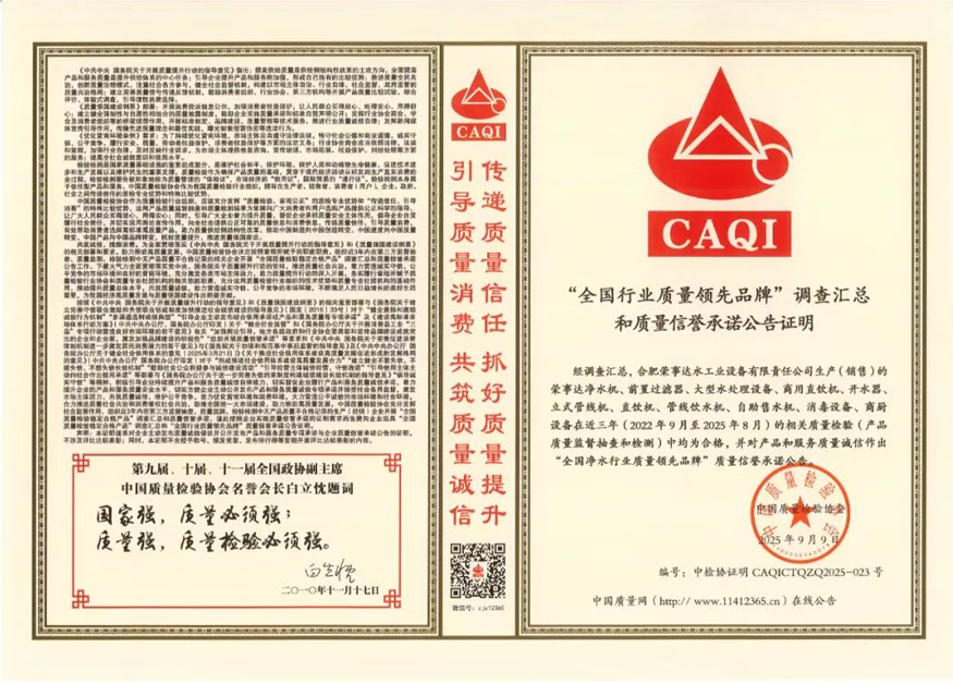加强质量支撑,共建质量强国。在由中国质量检验协会牵头组织的2025年全国“质量月”企业质量诚信倡议专题活动中,荣事达水工业公司凭借长期以来对产品品质的严苛坚守与积极正向的社会形象,成功通过协会多维度审核与专家团专业评定,最终一举斩获“全国净水行业质量领先品牌”“全国质量诚信先进企业”“全国质量检验信誉保障产品”“全国质量检验稳定合格产品”“全国消费者质量信誉保障产品”五项荣誉。