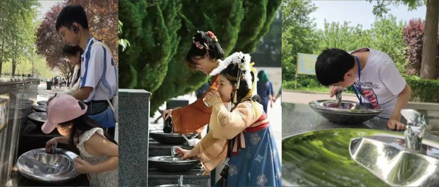 饮水点外形则采用兵马俑造型雕刻搭配天然大理石台体独特设计,按压式喷水龙头方式取水