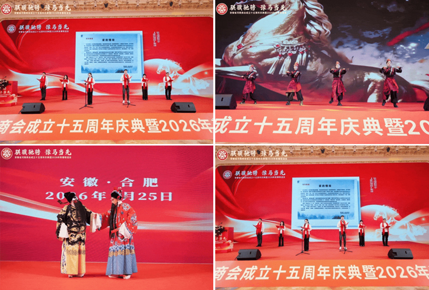 骐骥驰骋,豫马当先。元月25日下午,安徽省河南商会成立十五周年庆典暨2026年新春联谊会在合肥白金汉爵大酒店隆重举行。安徽省食品药品监督管理局原一级巡视员李长在,安徽省合作交流办公室副主任陈龙,安徽省社会组织总会会长、安徽省审计厅原一级巡视员贾宝明,安徽省工商联三级调研员宋翠琳,安徽省退役军人事务厅原一级巡视员梅德林,安徽省边防总队原政委袁同海,一〇五医院原副院长赵连才,安徽省国土资源厅原纪检组长江献军,安徽省委人事厅原编委办主任赵振英,安徽省经信厅原老干部局局长展岩,安徽省煤炭设计院原院长闫红新,安徽省卫生管理学院原副院长赵国子,安徽省委政法委原扫黑办副主任张剑锋,安徽省委党校原二级巡视员张金友等与驻马店市商务局副局长柳晓刚、市工商联副主席张永红等家乡领导出席盛会。在皖兄弟商会、省级异地商会及友好商协会、全体会员及社会各界朋友500余人齐聚一堂,共叙乡梓情谊,共话发展新篇。