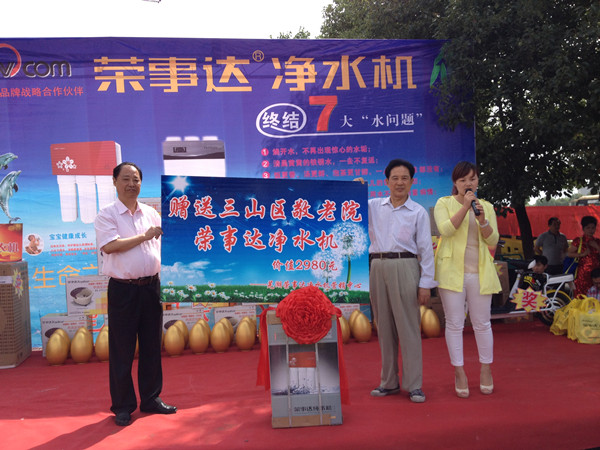 荣事达水工业公司一直践行公益,关注社会弱势群体饮水安全,芜湖营销管理中心自成立以来,开展了各种形式的公益活动。7月上旬,荣事达净水机携手芜湖市老年协会到三山敬老院进行慰问演出,为老人们奉上了精彩的歌舞表演,给他们带去了欢乐,并向该院捐赠了净水机,让老人们能喝上放心水。
