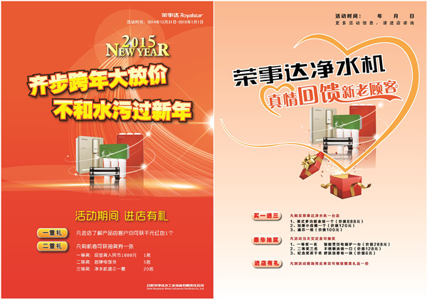 又至岁末,辞旧迎新,荣事达跨年献礼,感恩回馈,再掀净水狂潮。回首2014,居民饮水安全频频告急,安装家用净水机实现“纯净水自己造”,构筑饮水安全最后一道防线,成为居民生活头等大事。为普及净水,元旦期间,荣事达将在全国多个省份推行惠民政策,加强推广净水机的力度。顾客在元旦期间进店选购荣事达净水机,可获得超值大礼。逛店拿红包——顾客进店咨询产品信息,即可获赠千元红包;购机送好礼——购买荣事达纯水机,可获赠管线机、净洗机等精美大礼;欢乐抽大奖——顾客现场购机可参加抽奖活动,现金大奖、名牌家电、滤芯套装等各项大奖送不停。开心跨年,悦享净水。新的一年,荣事达净水机将以更优质的产品、更好的服务加速净水普及,真正让惠于民,让广大消费者喝上安全、健康的好水,提高居民生活品质。- [关闭] [打印]