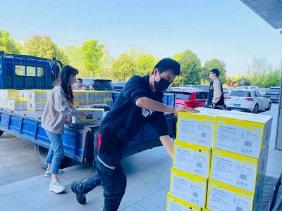 4月8日荣事达水工业集团工作人员以最快的速度进行物资的装载,满载着抗疫物资,发往37℃的爱活动统筹处。
