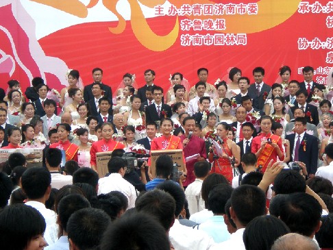 摘要:9月20日,备受关注的“圆百年梦想,结百年情缘——2008中国济南市齐鲁情玫瑰婚典”大型集体婚礼在济南市泉城广场开幕,本届是由济南市团市委、杭...