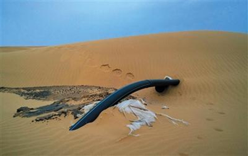 记者看到,每个排污池都有一个到数个白色“玻璃钢夹砂”管道通向沙漠,方向指向工业园。在排污池和化工园区之间的一公里多都是沙漠,记者从排污池向化工园区方向行走,不时可以看见暴露在外面的排污管道,在一些洼地,还可以看到一些直接向下插入沙土里的黑色橡胶管道,这些管道周边的细沙呈黑色。踢开表面,下面是黑色泥浆般的凝结物,发出一股恶臭味。